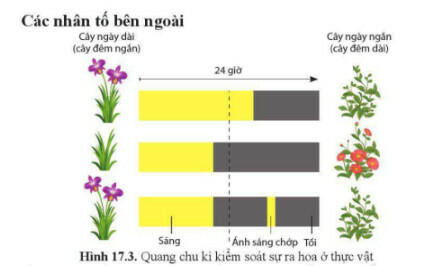 - Điều khiển sự ra hoa bằng dinh dưỡng, hormone hoặc chất điều hoà sinh trưởng, chế độ chiếu sáng và nhiệt độ thấp. Ví dụ: Khi trồng cây hoa cúc vụ đông, cần chiếu sáng bổ sung vào lúc 16 - 20h tối để kéo dài thời gian sinh trưởng sinh dưỡng, cây ra hoa đúng vụ tết.