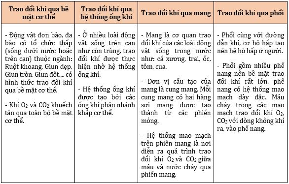 - Các hình thức hô hấp: Qua bề mặt cơ thể (động vật đơn bào, lưỡng cư, giun,...), qua ống khí (côn trùng), qua mang (cá, tôm,...) và qua phổi (lưỡng cư, bò sát, chim, thú).