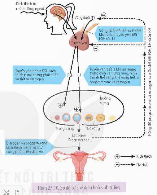 Cơ chế điều hòa sinh trứng được kiểm soát nhờ liên hệ ngược. Nồng độ progesterone và estrogen trong máu tăng gây ức chế vùng dưới đồi và tuyến yên, làm giảm tiết GnRH, FSH và LH.