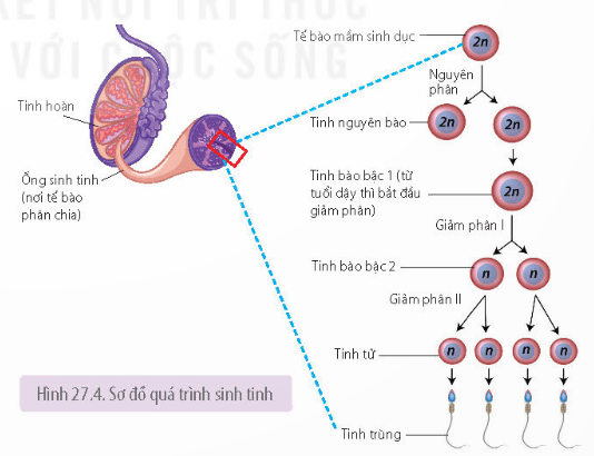 - Quá trình sinh tinh: tinh trùng hình thành trong ống sinh tinh của 2 tinh hoàn, bắt đầu từ tinh nguyên bào, trải qua quá trình nguyên phân và giảm phân.