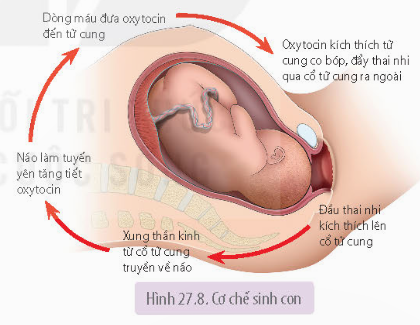- Oxytocin kích thích tử cung co bóp, kích thích nhau thai tiết ra prostagladin làm tử cung co bóp mạnh hơn → đẩy thai nhi ra ngoài.
