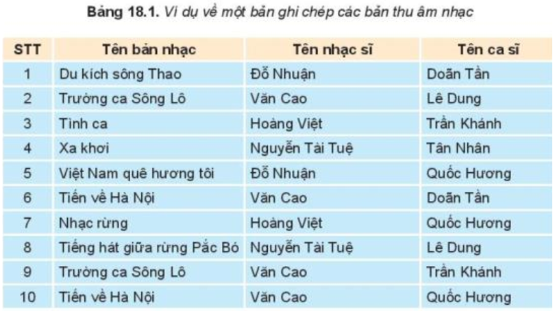 Cùng xem xét lại bài toán quản lí các bản thu âm nhạc. Ta sẽ quy ước nói đến nhạc sĩ sáng tác bản nhạc là nói đến tên một nhạc sĩ hay tên một nhóm nhạc sĩ sáng tác bản nhạc đó. Tương tự như vậy, ta cũng quy ước khi nói đến tên ca sĩ là nói đến một ca sĩ hay một nhóm ca sĩ biểu diễn tác phẩm. Dưới đây là một ví dụ về một bản ghi chép lại thông tin các bản thu âm.