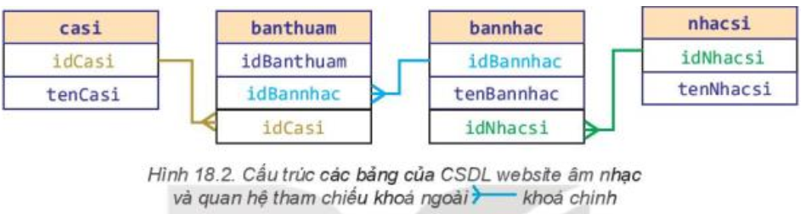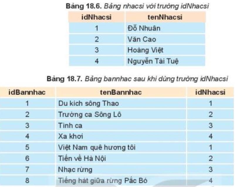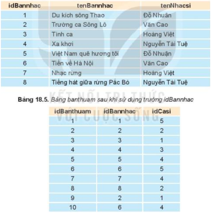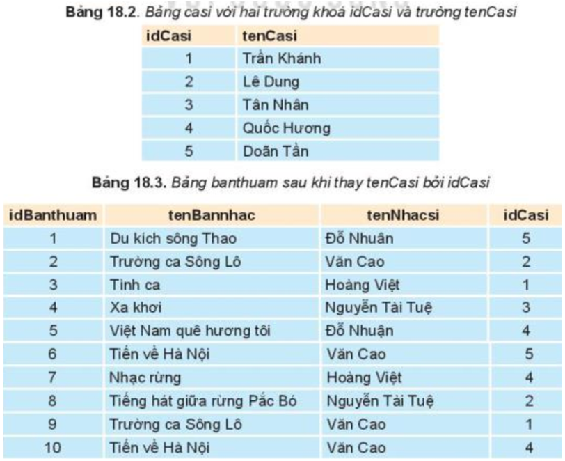 Tên nhạc sĩ trong bảng bannhac bị lặp lại do một ca sĩ có thể sáng tác nhiều bản nhạc; Ví dụ, trong bảng 18.1, nhạc sĩ Văn Cao xuất hiện trong hai dòng số 2 và số 6; vì vậy lại lập bảng nhacsi(idNhacsi, tenNhacsi) và thay thế trường tenNhacsi trong bảng bannhac bởi idNhacsi.
