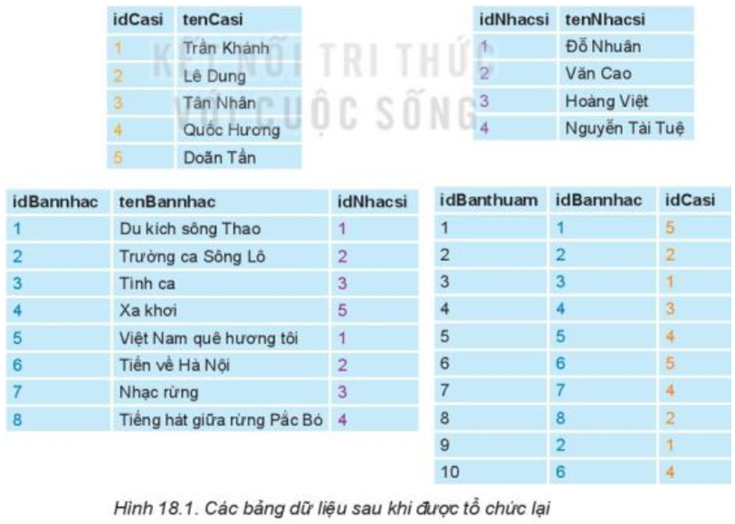 Một ca sĩ có thể là người thể hiện nhiều bản nhạc khác nhau nên trường tenCasi có giá trị lặp lại, tên ca sĩ lại dài, làm lớn dung lượng lưu trữ và khó khăn khi cần sửa chữa. Ví dụ, trong Bảng 18.1 ca sĩ Trần Khánh thể hiện hai bản nhạc (ở dòng số 3 và 9), khi cần sửa chữa tên của ca sĩ, sẽ phải tìm sửa ở tất cả những dòng có tên ca sĩ này.