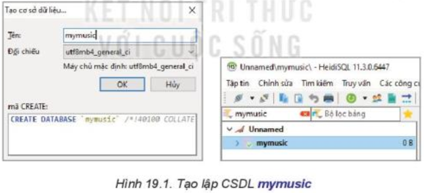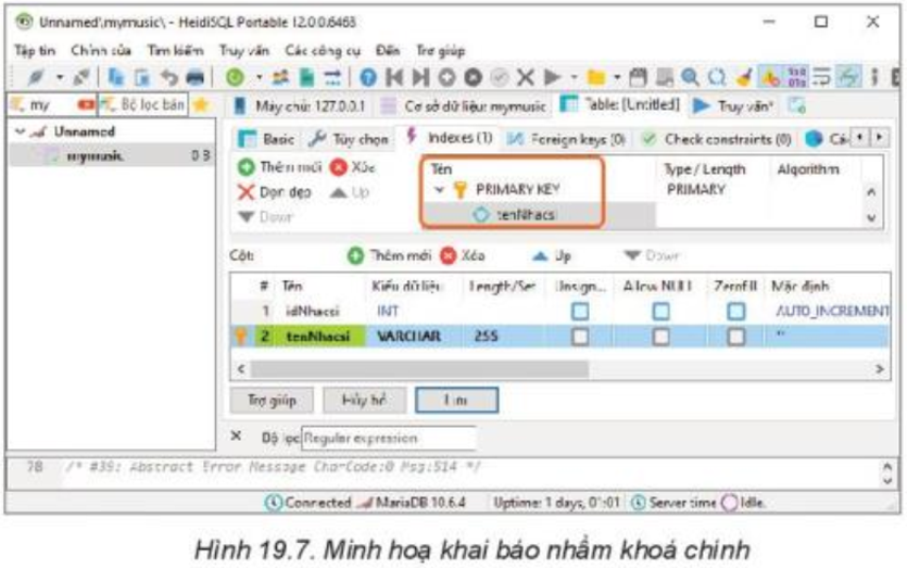 Nhiệm vụ. Tạo lập cơ sở dữ liệu mới tên là mymusic, khởi tạo bảng nhacsi, khai báo các khóa cho bảng này như thiết kế ở bài 18