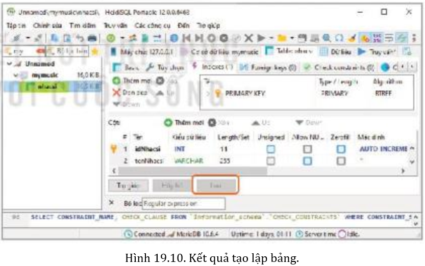 Cuối cùng chọn Lưu để lưu lại khai báo bảng nhacsi. Ở vùng hiển thị phía trái sẽ xuất hiện tên bảng nhacsi dưới dòng CSDL mymusic (Hình 19.10).