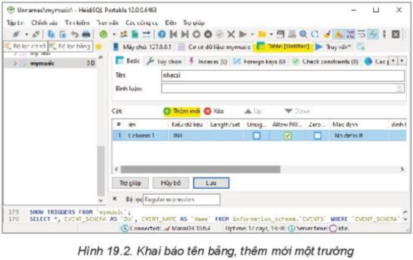 Nháy nút phải chuột ở vùng danh sách các CSDL đã có, chọn thẻ Tạo mới, chọn Bảng. Nhập tên: nhacsi, chọn Thêm mới để thêm trường. Một trường với tên mặc định Column1 sẽ xuất hiện phía dưới.