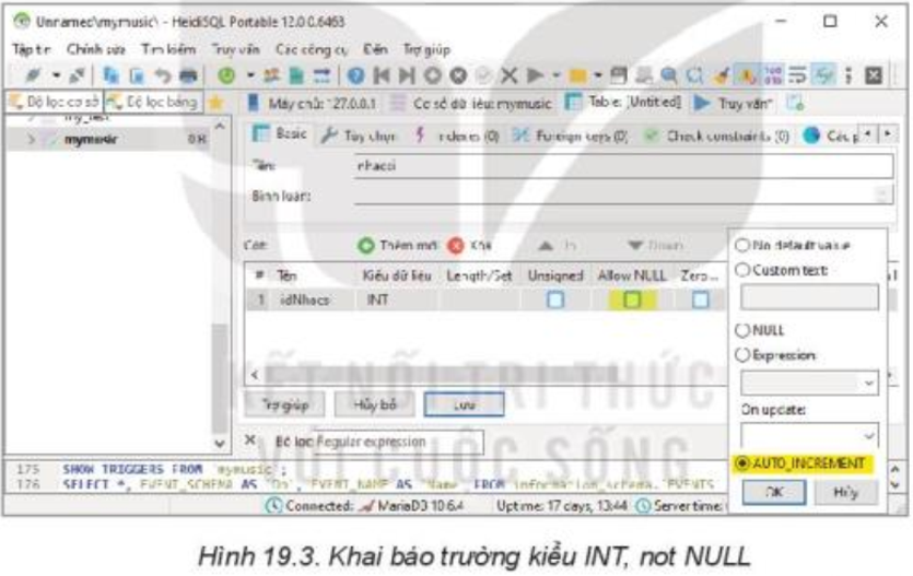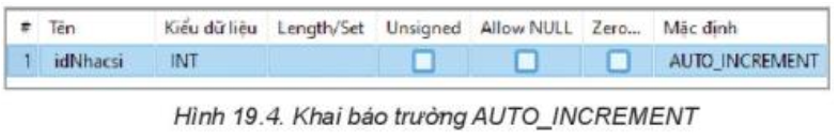 Chọn AUTO_INCREMENT, dưới nhãn Mặc định và chọn OK, để có kết quả như Hình 19.4.