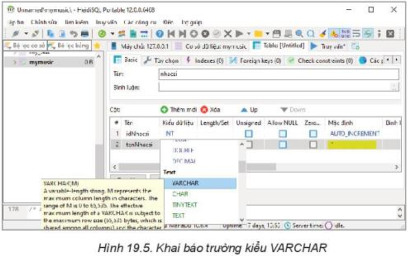 Nhập: tenNhacsi, chọn kiểu VARCHAR, độ dài 255, giá trị mặc định là kí tự rỗng “.