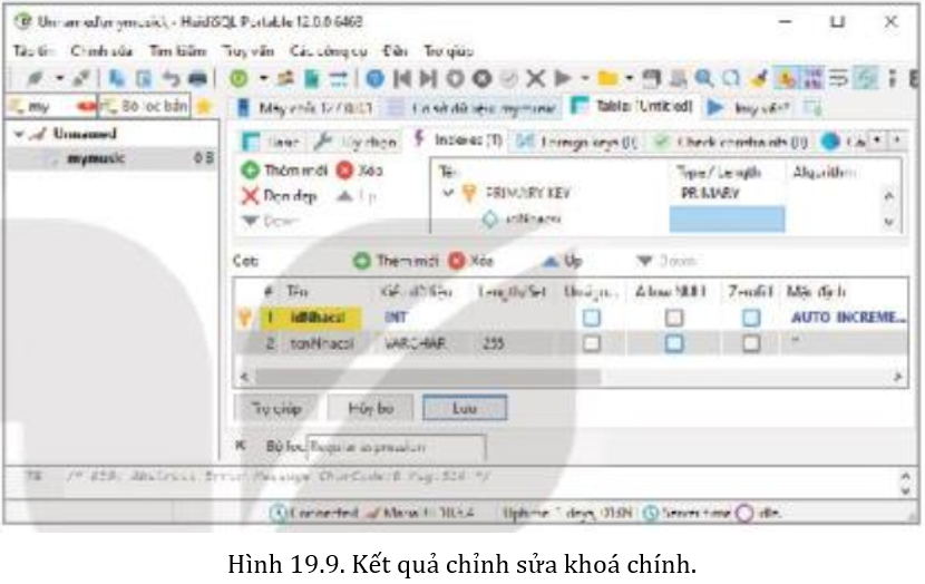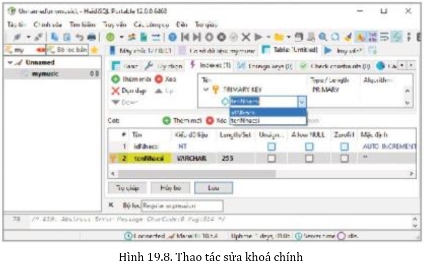 Để sửa khoá chính đã khai báo nhầm này, hãy nháy đúp chuột vào ô tenNhacsi ở dưới ô PRIMARY KEY ở phần trên và chọn lại idNhacsi (Hình 19.8).