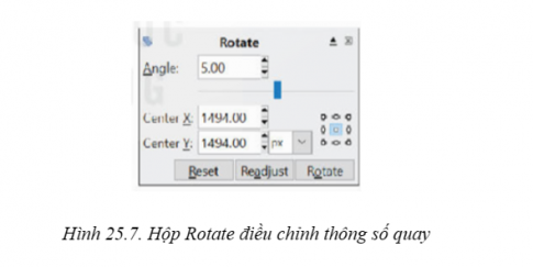 Bước 3. Kéo thả chuột để xoay ảnh đến khi ưng ý. Cách khác, thay đổi giá trị góc quay (Angle), tâm quay trên hộp Rotate rồi nháy chuột vào nút Rotate để xoay hoặc nháy chuột vào nút Reset nếu muốn quay lại hình ảnh ban đầu.