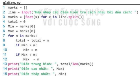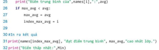 Phân tích: Nhiệm vụ này có thể được thực hiện bằng cách sử dụng mảng một chiều, cụ thể là sử dụng danh sách trong python. Việc nhập điểm được thực hiện ngay trên màn hình. Sau khi đã có danh sách các đầu điểm, dùng cấu trúc for để lặp qua các phần từ của mảng để tính tổng điểm, thống kê điểm cao nhất, thấp nhất.