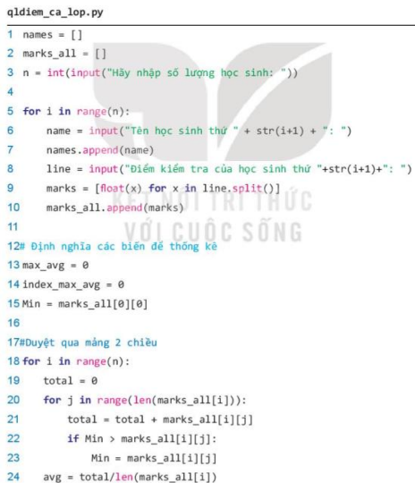 Phân tích: Nhiệm vụ này có thể được thực hiện bằng cách sử dụng một mảng hai chiều để lưu tất cả điểm của học sinh trong lớp, mỗi hàng là điểm của một sinh viên, điểm cụ thể là các phần tử của hàng. Để thống kê cần dùng vòng lặp để duyệt qua từng hàng, tính trung bình từng hàng và xét từng điểm để tìm ra đầu điểm thấp nhất. Trong khi tinh, tìm điểm trung bình kiểm tra của từng học sinh, cần lưu lại số thứ tự của học sinh có điểm trung bình cao nhất để tham chiếu in ra tên của học sinh đó.