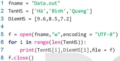 Chú ý: Tham số file = <đối tượng file> là bắt buộc khi cần đưa dữ liệu ra tệp. Tất cả các tham số khác của lệnh print() vẫn có giá trị khi đưa dữ liệu ra tệp.