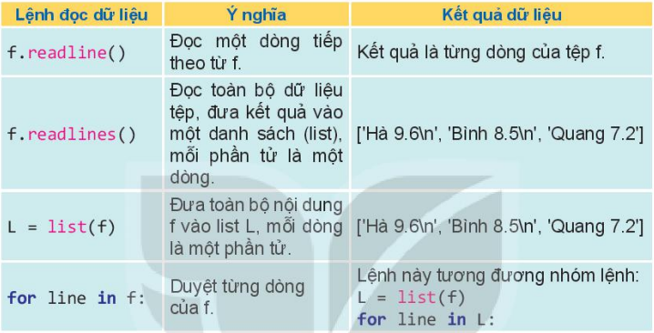 Các lệnh đọc dữ liệu từ đối tượng f trong Python