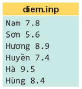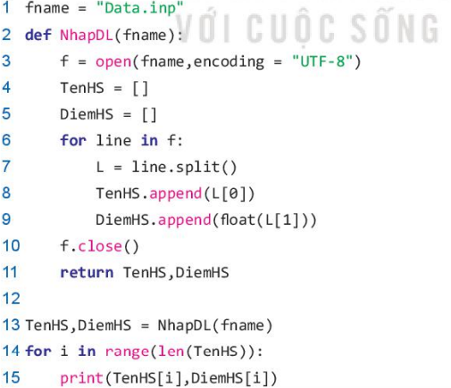 Ví dụ 1. Với bộ dữ liệu trên, cần đọc và đưa vào hai list là TenHS và Diem HS. Chương trình sau đọc dữ liệu từ tệp Data.inp, đưa dữ liệu vào hai mảng trên và hiển thị kết quả ra màn hình.