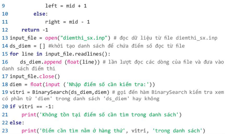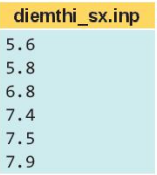 Yêu cầu: Viết chương trình kiểm tra điểm thi của các học sinh trong một lớp học. Điểm thi của học sinh được ghi trong tệp diemthi_sx.inp, trong đó mỗi điểm thi của các học sinh được viết trong một hàng và được sắp xếp theo thứ tự tăng dần. Chương trình đọc dữ liệu điểm thi từ tệp, sau đó cho phép người dùng nhập một điểm số cần kiểm tra. Nếu điểm số có tồn tại thì in ra vị trí mà điểm số đó xuất hiện trong tệp, nếu điểm số không tồn tại thì in ra thông báo điểm số không tồn tại. Ví dụ tập có cấu trúc như Hình dưới.