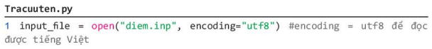 Chú ý: Tham số "r" có thể bỏ qua. Tham số encoding dùng khi mở tệp văn bản có mã Unicode, ví dụ tiếng Việt. Nếu không có tham số encoding thì chỉ đọc được văn bản có mã ASCII.