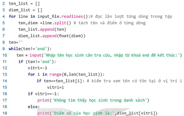 Phân tích bài toán: Nhiệm vụ này có thể được thực hiện thông qua thuật toán tìm kiếm. Với dữ liệu đầu vào là tên của học sinh, chương trình cần sử dụng thuật toán tìm kiếm để kiểm tra xem tên của học sinh có tồn tại trong danh sách không. Nếu tồn tại thì học sinh cần tìm nằm ở vị trí nào trong danh sách. Do tên học sinh và điểm số được nhập vào danh sách theo cùng một thứ tự, từ vị trí tên học sinh trong danh sách tên, chúng ta có thể suy ra điểm số của học sinh đó trong danh sách điểm.