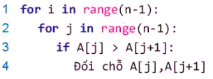 - Chỉ số j chạy từ 0 đến n - 2 và kiểm tra hai phần tử liền nhau A[j], A[j + 1], nếu chưa sắp thứ tự đúng thì đổi chỗ.