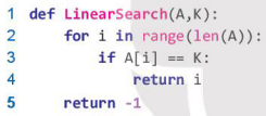 - Đối với mã lệnh trên, chương trình sẽ thực hiện duyệt mảng và với mỗi bước lặp sẽ kiểm tra phần tử thứ i có bằng với phần tử cần tìm kiếm không (dòng 3). Nếu bằng, thì chương trình sẽ trả về chỉ số của phần tử tìm thấy và kết thúc (dòng 4). Như vậy, chương trình có thể kết thúc khi chưa duyệt hết mảng (trường hợp đã tìm thấy phần tử) và tối đa là duyệt hết mảng. Như vậy, trong trường hợp tồi nhất vòng lặp ở dòng 2 sẽ thực hiện n bước lặp, mỗi bước lặp sẽ thực hiện lệnh so sánh ở dòng 3 tốn 1 đơn vị thời gian.