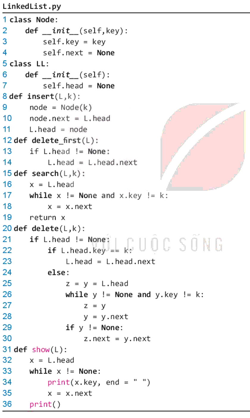 + Hàm xoá phần tử có khoá k trong danh sách L. Nếu phần tử cần xoá là node đầu tiên, sử dụng hàm delete_first(). Nếu không, duyệt danh sách và lưu trữ node trước của node cần xoá. Nếu tìm thấy thì sử dụng lệnh x.next = y.next để xoá.