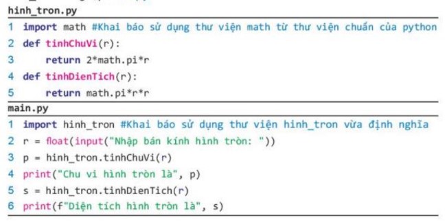 - Viết thư viện hinh_tron gồm hai hàm để tính chu vi và diện tích của hình tròn với tham số của hàm số là bán kính. Trong thư viện này, hãy sử dụng hằng số math.pi là giá trị của số Pi được định nghĩa ở thư viện math.