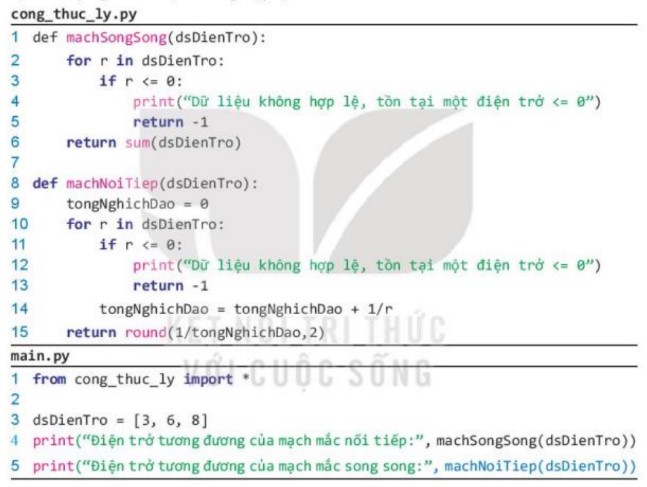 - Tạo thư viện cong_thuc_ly gồm hai hàm machSongSong(dsDienTro) và machNoiTiep(dsDienTro) để tính điện trở tương đương của mạch nối tiếp và song song gồm các điện trở được cho giá trị tính theo Ohm trong mảng dsDienTro.