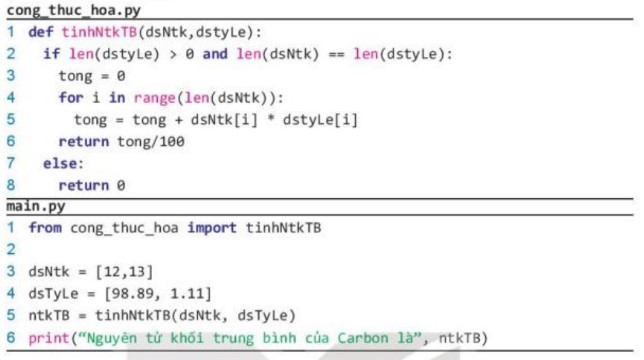 - Em hãy định nghĩa hàm tinhNtkTB(dsNtk, dstyLe) trong file cong_thuc_hoa.py để tính nguyên tử khối trung bình của một nguyên tố hoá học trong đó tham số dsNtk là mảng giá trị các nguyên tử khối của các đồng vị và dstyLe là tỉ lệ phần trăm số nguyên từ của các đồng vị của nguyên tố đó.