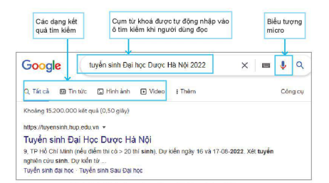 - Bước 2. Tìm kiếm bằng từ khóa nhập bằng tiếng nói. Nháy chuột vào biểu tượng micro cạnh ô nhập từ khóa tìm kiếm (Hình 7.1), sau đó, đọc từ khóa tìm kiếm, sau khi dùng đọc, máy tìm kiếm sẽ hiển thị kết quả tìm kiếm như Hình 7.1.
