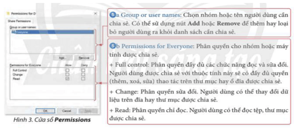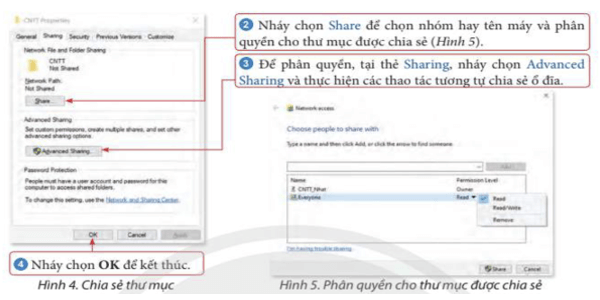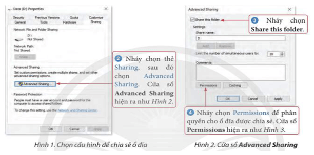 a) Để chia sẻ ổ đĩa yêu cầu phải nhấp chuột phải vào ổ đĩa, chọn Properties, rồi tiếp tục chọn OK trong các cửa sổ Permissions, Advanced Sharing, Properties.