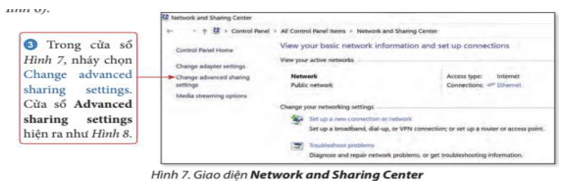 Trong cửa sổ Hình 7, nháy chọn: Change advanced>sharing settings>Cửa sổ Advanced>sharing settings | hiện ra như Hình 8.