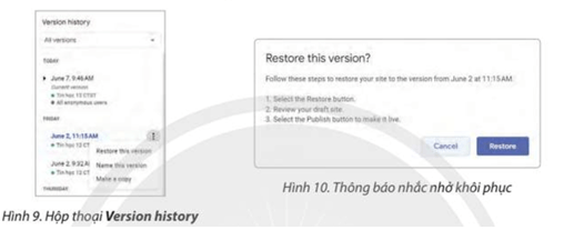Với mỗi phiên bản, có thể tuỳ chọn Restore this version (khôi phục phiên bản), Name this version (đặt tên phiên bản) và Make a copy (tạo bản sao). Để khôi phục một phiên bản lưu trữ, chọn lịch sử phiên bản. Chọn Restore this version để xuất hiện hộp thoại thông báo, thực hiện theo các bước và chọn Restore để khôi phục lịch sử (Hình 10).