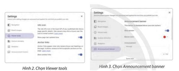 Trong hộp thoại Settings, chọn Announcement banner (phần thông báo), có các tùy chọn (Hình 3):