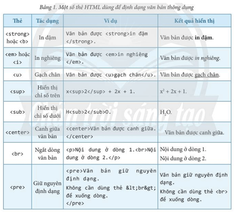 HTML có nhiều thẻ định dạng văn bản. Bảng 1 dưới đây liệt kê một số thẻ định dạng văn bản thông dụng.