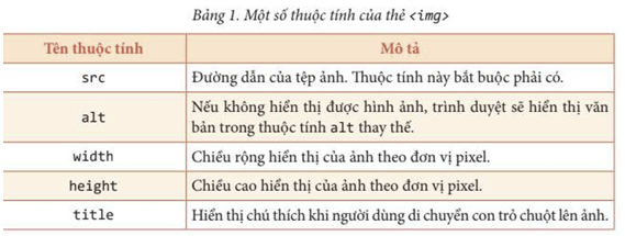 thẻ đóng. Khi sử dụng thẻ này, ta phải chỉ định đường dẫn của tệp ảnh trong thuộc tính src. Bên cạnh đó, em có thể chỉ định kích thước hiển thị của tệp ảnh (chiều rộng và chiều cao) thông qua thuộc tính width và height.