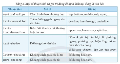 CSS cung cấp nhiều cách để định kiểu cho văn bản. Để căn chỉnh văn bản theo phương ngang, dùng thuộc tính text-align với các giá trị left, right`, center, và justify. Để căn lề theo phương dọc trong một phần tử HTML khác, dùng thuộc tính vertical-align với các giá trị top, bottom, middle, sub, và super. Ngoài ra, có thể định kiểu khoảng cách giữa các kí tự, từ, và hiệu ứng đổ bóng của văn bản bằng các thuộc tính tương ứng trong Bảng 2.