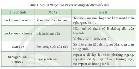 Một số thuộc tính định kiểu nền khác được trình bày trong Bảng 3.