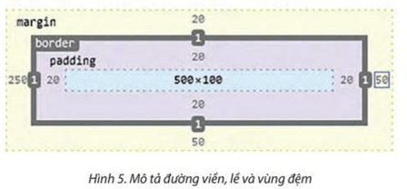 Hình 5 minh họa: nội dung màu xanh nhạt, viền màu xám dày 1px, vùng đệm màu tím rộng 20px mỗi hướng, lề màu vàng với các giá trị 20px, 50px, 50px và 250px tương ứng các hướng.