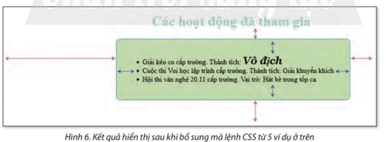 Kết quả hiển thị như Hình 6. Trong đó, các giá trị của thuộc tính margin được minh họa bằng các mũi tên màu đỏ và các giá trị của thuộc tính padding được minh hoạ bằng các mũi tên màu xanh.