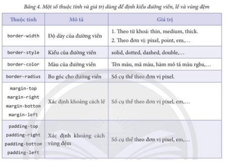 Một số thuộc tính định kiểu đường viền, lề và vùng đệm khác được trình bày trong bảng 4.