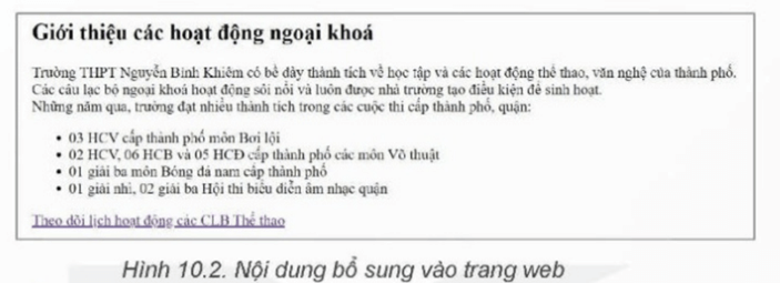 Sử dụng danh sách và bảng đã tạo trong Bài 9. Em hãy thêm phần giới thiệu lên phía đầu trang và đặt liên kết từ vị trí “Theo dõi lịch hoạt động các CLB Thể thao” tới bảng “Lịch hoạt động các CLB Thể thao” bên dưới.