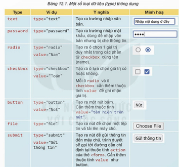 – Thuộc tính type xác định loại dữ liệu mà phần tử input chứa. Bảng 12.1 mô tả một số loại dữ liệu (type) thông dụng. Nội dung ví dụ nằm trong thẻ input sau mã định danh và trước thuộc tính name.