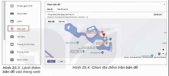 – Việc thêm bản đồ vào trang web thực chất là nhúng ứng dụng bản đồ vào trang web. Có thể sử dụng lệnh Nhúng trong bảng chọn Chèn để chèn bản đồ. Tuy nhiên, nếu muốn nhúng Google Maps vào trang web thì chỉ cần chọn Bản đồ (Hình 25.3) ở nhóm thứ ba của bảng chọn Chèn.