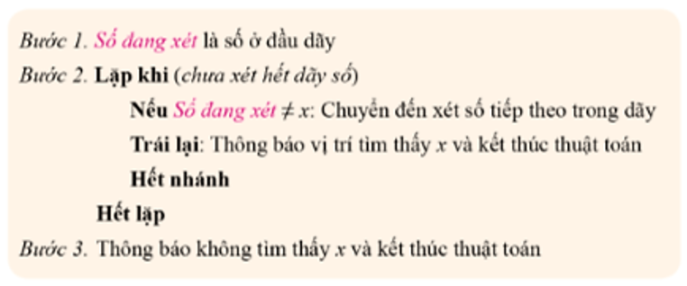 Thao tác so sánh từng phần tử của dãy với số cần tìm được lặp đi lặp lại cho tới khi tìm thấy kết quả hoặc tìm hết dãy.