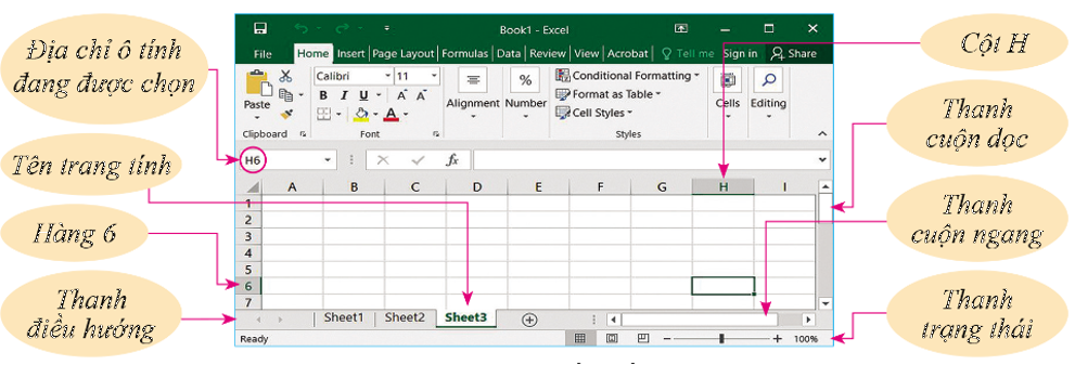 Các thành phần chính trên trang tính gồm có:
