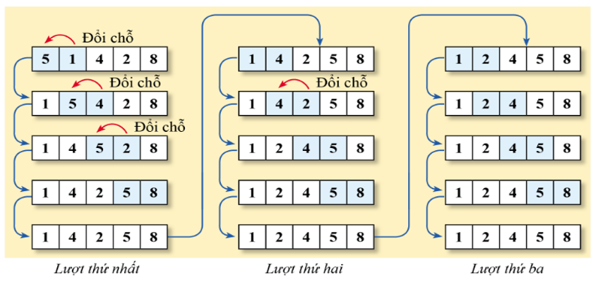 Trong ví dụ trên, robot thực hiện số lượt di chuyển từ đầu đến cuối dãy để so sánh và đổi chỗ các cặp phần tử liền kề nếu chưa đúng thứ tự.