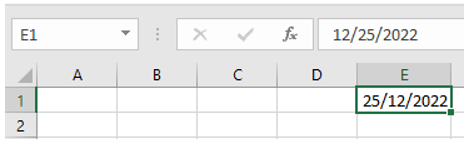 Trong ô E1 đang có dữ liệu 12/25/2022 là định dạng kiểu Anh-Mỹ, vì vậy sau khi định danh hiển thị kiểu ngày tháng kiểu Việt Nam, thì dữ liệu trong ô E1 là 25/12/2022.