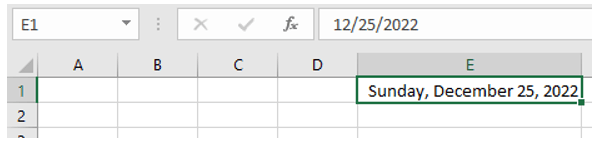 Trong ô E1 đang có dữ liệu 12/25/2022 nếu ta thực hiện định dạng kiểu Long Date thì dữ liệu trong ô E1 là <Thứ của ngày 25/12/2022>, December 25,2022, chính xác là Sunday, December 25, 2022