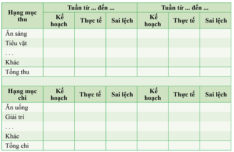 Nhiệm vụ: Phác thảo thiết kế và tạo lập một sổ tính Excel phục vụ mục đích lên kế hoạch và theo dõi thực hiện thu chi cá nhân theo tuần.